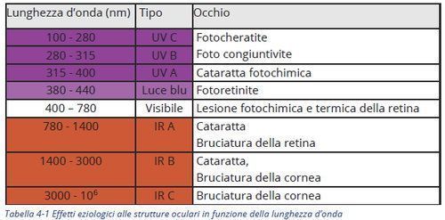 Riprendiamo dal documento una tabella relativa agli effetti eziologici alle strutture oculari in funzione della lunghezza d’onda: