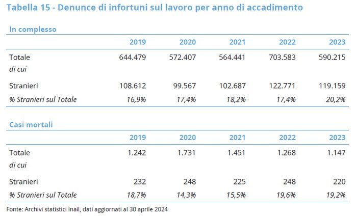 Confrontando i dati dei lavoratori italiani si indica che nel quinquennio “le denunce dei nati all’estero hanno mostrato un andamento altalenante: una diminuzione dell’8,3% tra l’anno 2019 e il 2020, dovuto alla pandemia, una crescita del 23% circa nel biennio successivo e poi nuovamente un calo del 3% circa nel 2023”. Differenze rilevanti rispetto ai lavoratori nati in Italia che “nel periodo 2019-2021 hanno avuto una diminuzione del 14,1%, nel 2022 un aumento del 26% circa e poi nel 2023 nuovamente un calo del 19% circa rispetto all’anno precedente”.